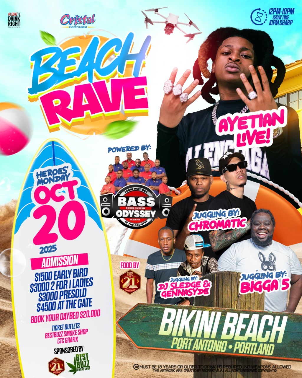 Bikini beach, Port AntonioCristal Entertainment presents Beach Rave on Hero’s Monday, October 20, 2025 at Bikini Beach, Port Antonio. Live performance by Ayetian. Entertainment by Bass Odyssey, Chromatic, Bigga 5 and DJ Sledge & Gennasyde.