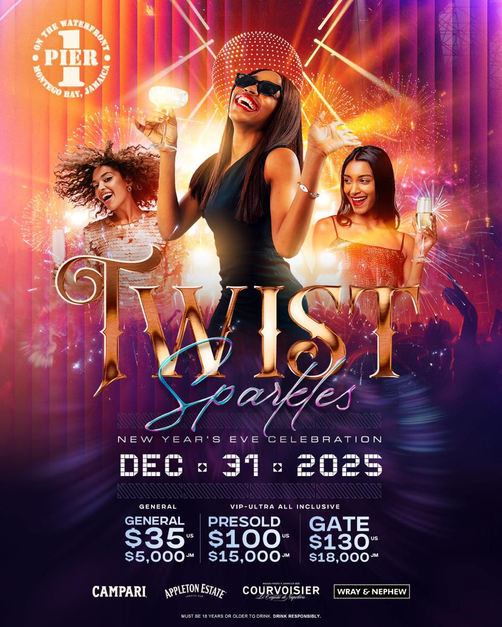 Pier One, Montego Bay, JamaicaThere is no better place to ring in the New Year with a Twist than at Pier 1 on the waterfront. Montego Bay's leading New Year's Eve Party TWIST is back!. Its an ultra All Inclusive event! Top shelve and food all night.. Champagne at Midnight. Of course there will be fireworks!