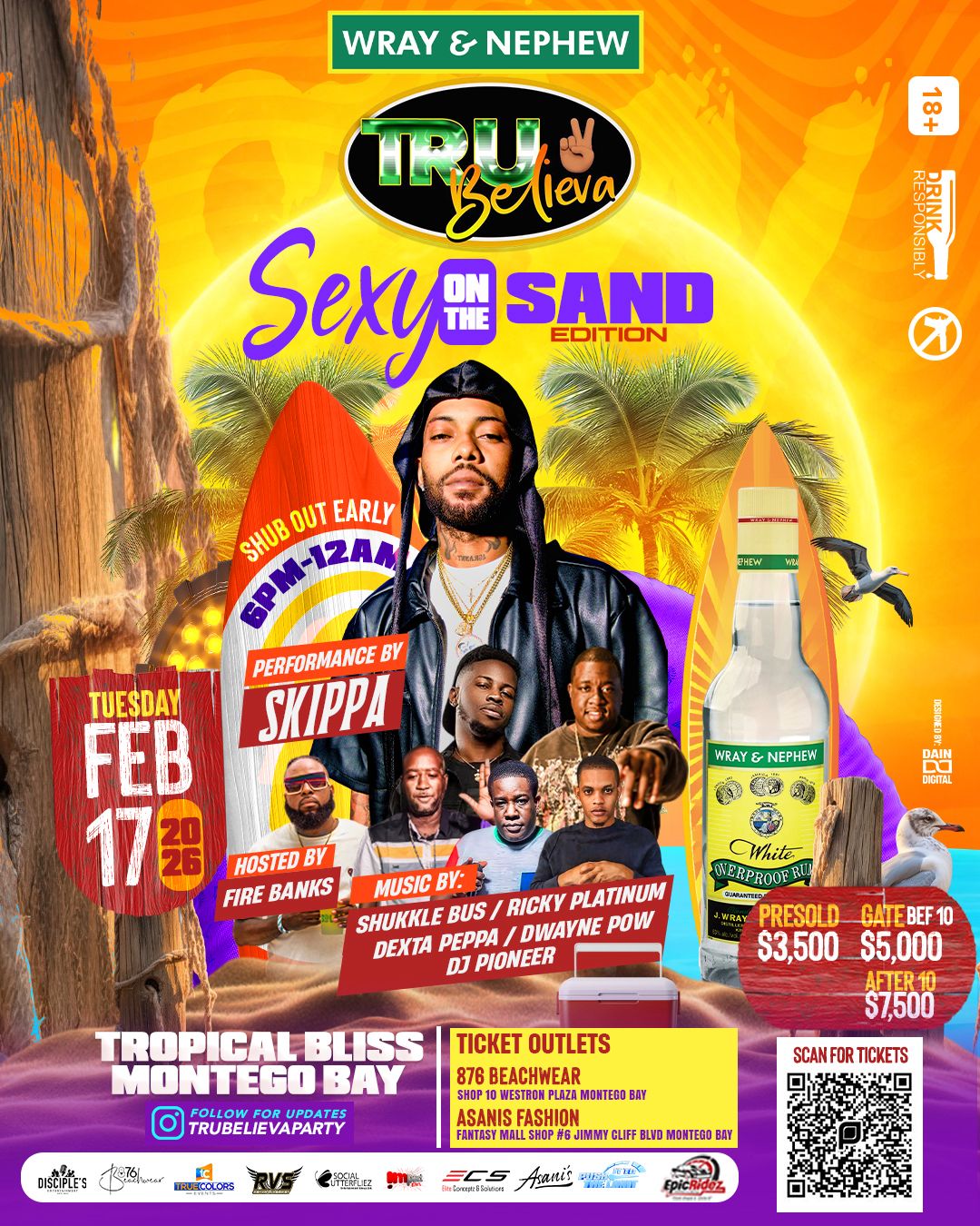 Tropical Bliss, Montego Bay, JamaicaTru Beliva Sexy on the Sand Edition is back on Tuesday, February 17, 2026, at Tropical Bliss Beach, Montego Bay. Time 6 PM-12 AM is strictly enforced. Presold $3500, Gate $5000. Music by: Shukkle Bus, Ricky Platinum, Dexta Peppa, DJ Pioneer, and Dwayne Pow. Bottle Service by Social Butterflies.