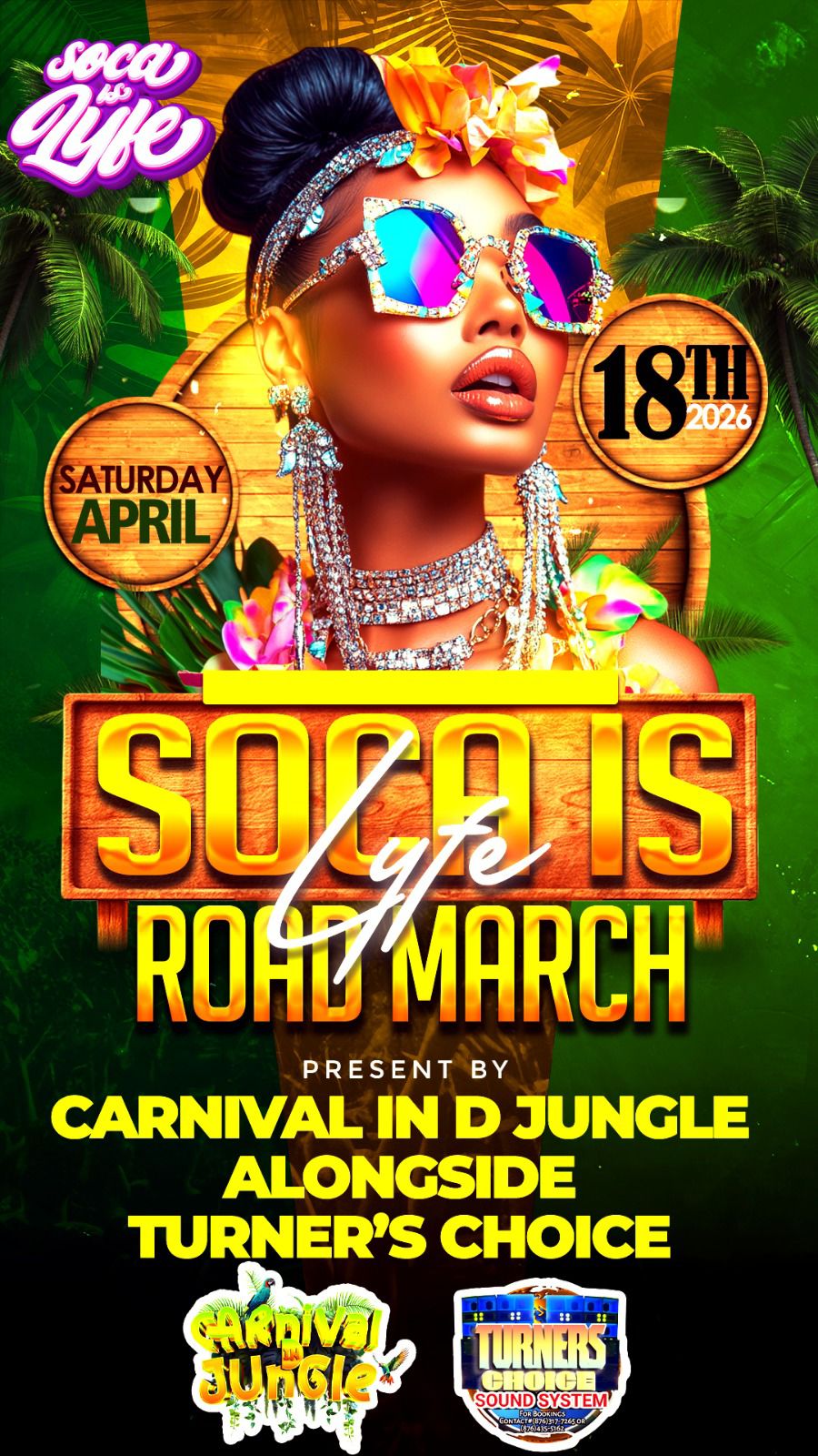 Arnett Gardens Mini Complex & Play Park, Kingston, JamaicaSoca is Life Road March is coming on Saturday, April 18, 2026, presented by Carnival in the Jungle alongside Turner's Choice Sound System. Music by Turner's Choice, Top Star, JPS Djs: World Jet, Insane, Quick Mix, Jubba. Food and refreshment on sale.