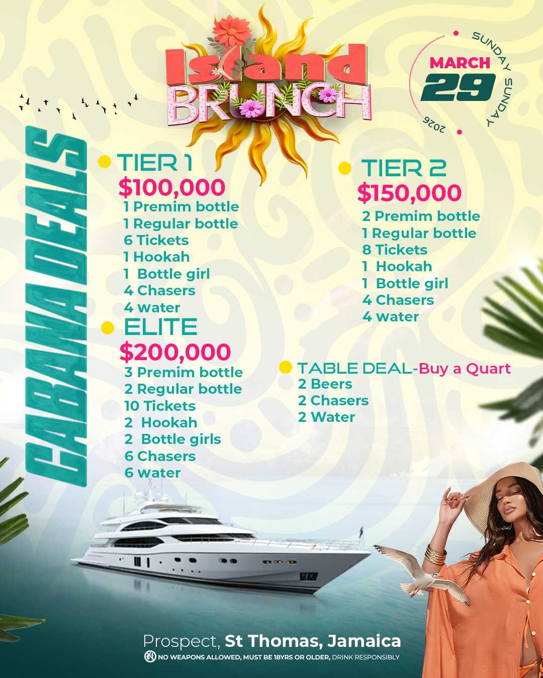 Cerulean Bay Jamaica, St. Thomas Parish, JamaicaAt Island Brunch, we’re more than just an event — we’re a lifestyle movement! Our mission is to create unforgettable luxury experiences where food, music, Jamaican culture, and style come together on one private island paradise. Every detail, from the curated brunch menu by Eskay Catering to the all-day entertainment lineup, is designed to celebrate elegance, connection, and good vibes. Cabana and table deals available: contact +1 (914) 960-4164 for more details.