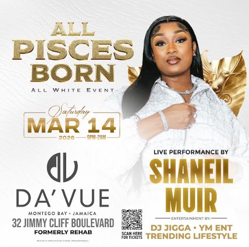32 Jimmy Cliff Boulevard, Montego Bay, JamaicaAll Pisces Born is back again on Saturday, March 14, at Da'Vue, formerly Rehab Sports Bar, Montego Bay. Its the ALL WHITE Edition featuring live performance by dancehall royalty Shaneill Muir! Pisceans its your season!