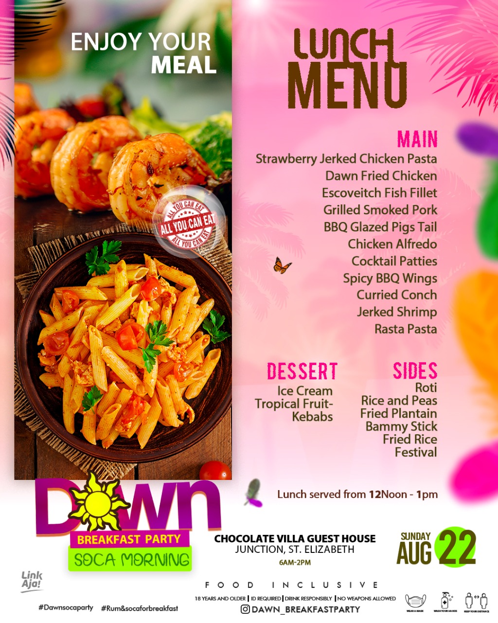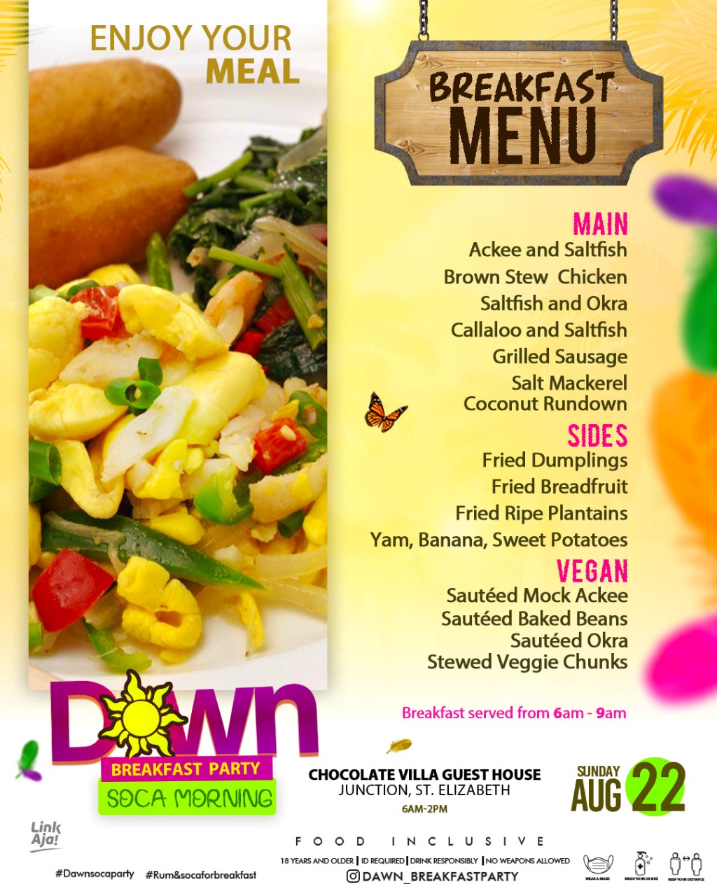 CHOCOLATE VILLA GUEST HOUSE, JUNCTION, ST. ELIZABETHDAWN BREAKFAST PARTY☀️ *código de vestimenta* Make a statement under the sun in your best outfits, come out in your colours as vibrant as the music. OBSERVE ALL COVID-19 RELATED PROTOCOLS. Can’t wait to see you there!