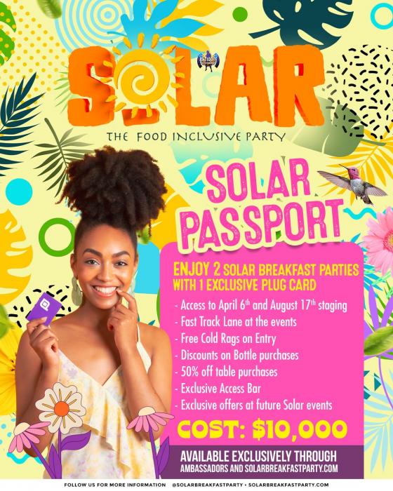 SOLAR PASSPORT LOUNGE 2025!! Enjoy 2 Solar Breakfast Parties with 1 Exclusive PLUG Card Access April 6th and September 7th Solar Fast Track lane at both parties Free cold rag on entry Discount on bottle purchases 50% off table purchases Exclusive access bar Exclusive offer on future Solar event Available exclusively through select ambassadors and solarbreakfastparty.com